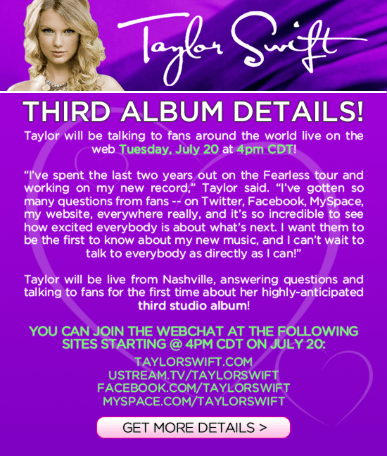 During the live chat, Taylor is going to field questions posted through Ustream.tv, Facebook and MySpace. Further details now say she will not take questions submitted before the chat, but only ones during it. The chat will be focused on her third album. The chat is scheduled for 4pm, Nashville time (or, like I prefer to call it, Taylor time!) this is Central Daylight Time. To find out what time that is going to be in your part of the world, please check the Time World Clock. If you’re in Los Angeles that’s 2PM. If you’re in New York, Miami or Montreal that’s 5pm. If you’re in London, UK that’s 10pm. If you’re in Brussels, Belgium that’s 11pm. If you’re in Sydney, Australia that is 7 am of Wednesday, July 21.