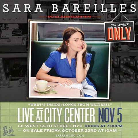 Miss I’m-not-going-to-write-you-a-love-song herself, Sara Bareilles, has written the music and the lyrics to a new musical, Waitress, that was already a hit at the American Repertory Theater. Now that the play is about to hit Broadway, Sara is making an event for one night only of her album release. If you’re reading this, it’s too late. It’s today, November 5, at the City Center in New York City. But guess what, you can still watch it.